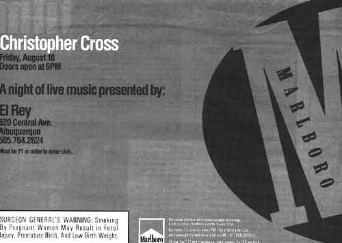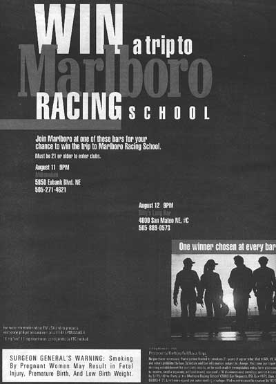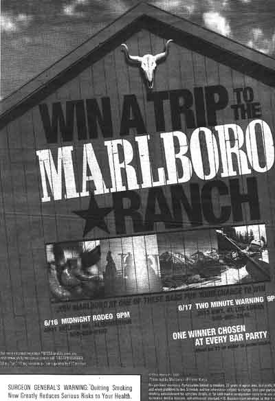 PHILIP MORRIS ADDS TO DECEPTION The Marlboro connection is clearly evident. Following the TIM template, the advertisement highlights many of Albuquerque's trendy spots. These include Boot Scoots Nite Club, Howie's Sports Page, Sneakerz, Two Minute Warning, Sunset Bar & Grill and Metropolis. |